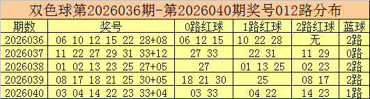 开奖回顾:双色球第2026040期开出奖号:03 04 14 22 23 33 + 04。其中,红球号码012路比为2:2:2,其中012路号码开出个数相等。蓝球号码为1路号码。